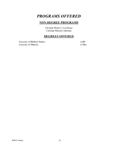 PROGRAMS OFFERED NON-DEGREE PROGRAMS Christian Worker’s Certificate Christian Ministry Diploma DEGREES OFFERED Associate of Biblical Studies A.BS Associate of Ministry A.Min. RMCI Catalog 21